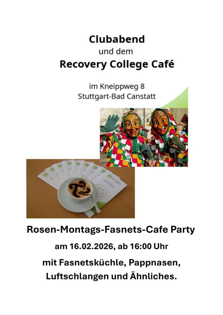 | 3. Montag | Clubabend mit Vortrag (Recovery College) | 18:00 |